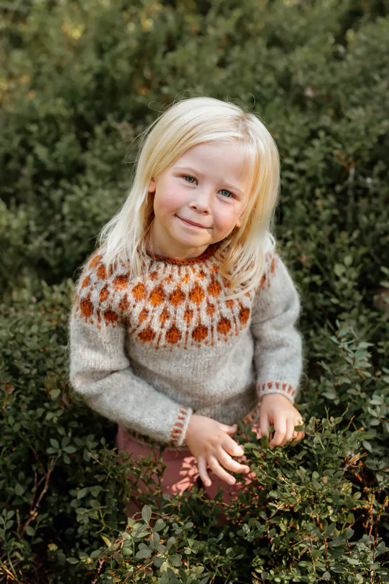 Den nydelige Multebær Genser Mini er designet av Christina Gjertsen @sisuknitwear. Multebær Genser Mini strikkes nedenfra og opp, og halskanten strikkes etter ønske.